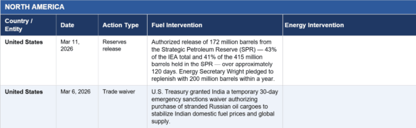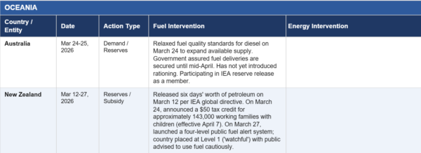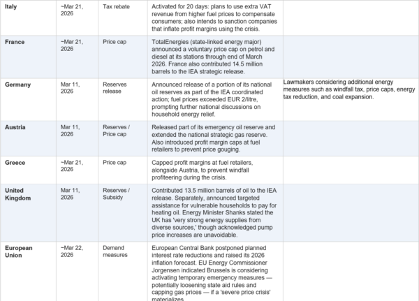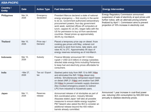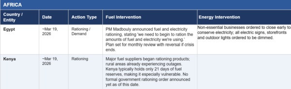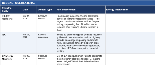 Expected interventions vary by the severity of the supply shock and the individual country’s access to reserves and alternative sources. More direct interventions are most widespread in Asia, where the supply shock is hitting hardest, and broader reserve releases have been the focus of top economies and producer-country responses. The largest global response has been a record release of strategic reserves, with countries across the globe contributing to a total 400 million barrel release. Countries across Asia have put in place petroleum export restrictions or taxes, with China and Thailand suspending fuel exports within days of the conflict’s start, and much of Asia has begun implementing voluntary travel reductions, carpooling measures, and closure of offices or a move to remote work with the goal of reducing consumption. More measures that are beginning to spread beyond Asia include slashing tariffs, loosening of fuel standards, and tax reductions to offset the strain placed on domestic consumers and address rising fuel costs. More drastic actions, such as fuel and electricity rationing or mandated blackouts, are yet to become widespread, but fuel rationing has already been imposed in some countries, such as Slovenia, Bangladesh, and Egypt.