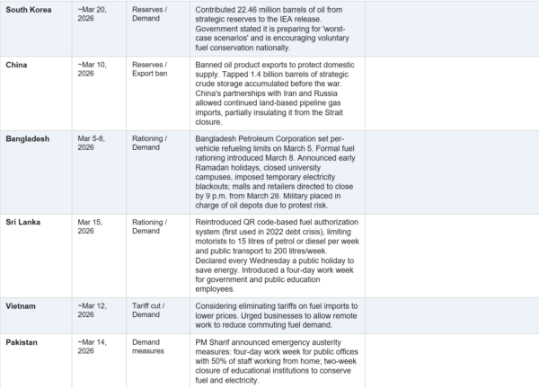 Specific actions taken by governments and multilateral bodies through March 31, 2026, in response to the Strait of Hormuz closure and resulting global fuel and diesel shortages. Grouped by region.